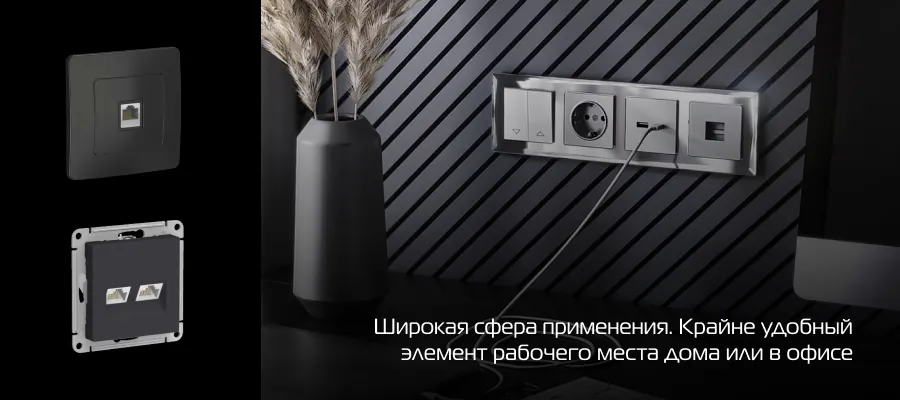 Внешне такая розетка напоминает обычную, только вместо контактов под 220 В стоит модуль под сетевой кабель. В продаже есть одиночные, двойные, а иногда и тройные модели, рассчитанные на подключение одного или нескольких устройств. Также розетки могут иметь универсальное назначение – например, совмещать в одной рамке компьютерную розетку и телефонную розетку RJ11, если нужно одновременно подключить интернет и аналоговую телефонную линию.